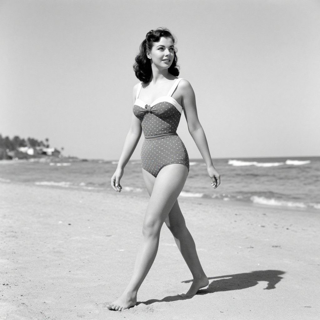 A vintage black-and-white photograph captures a woman in a classic Esther Williams-inspired swimsuit, gracefully walking along a sunlit beach with a retro aesthetic, showcasing timeless elegance against a backdrop of serene coastal scenery.