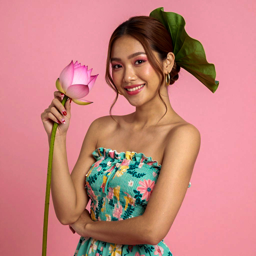 Full body portrait of an elegant Thai woman with long straight hair wearing a traditional pink silk Thai dress with floral embroidery. She stands with hands in a traditional Thai greeting gesture (wai) against a rich clay hue studio background, framed by vibrant floral garlands.