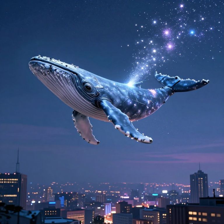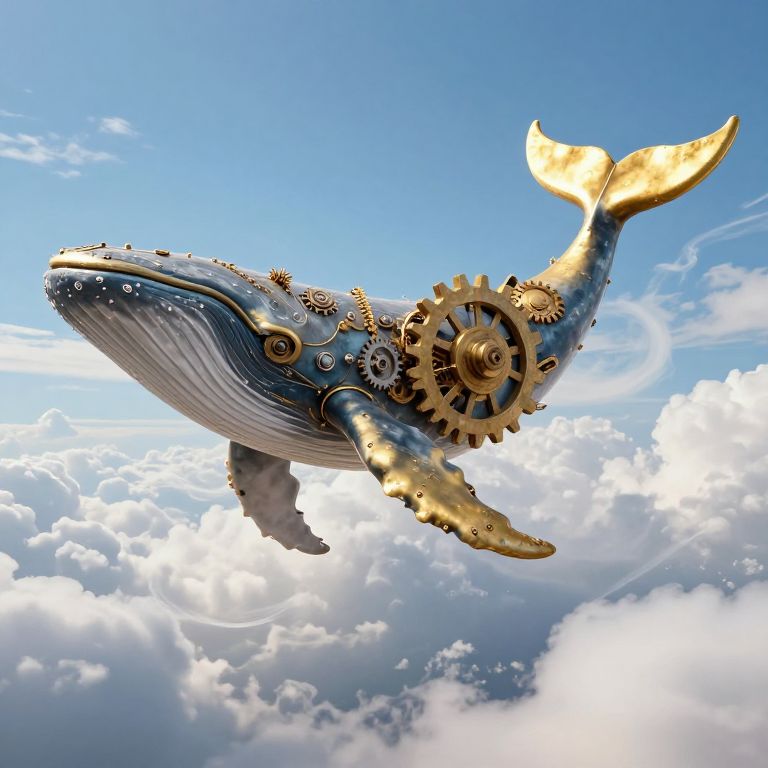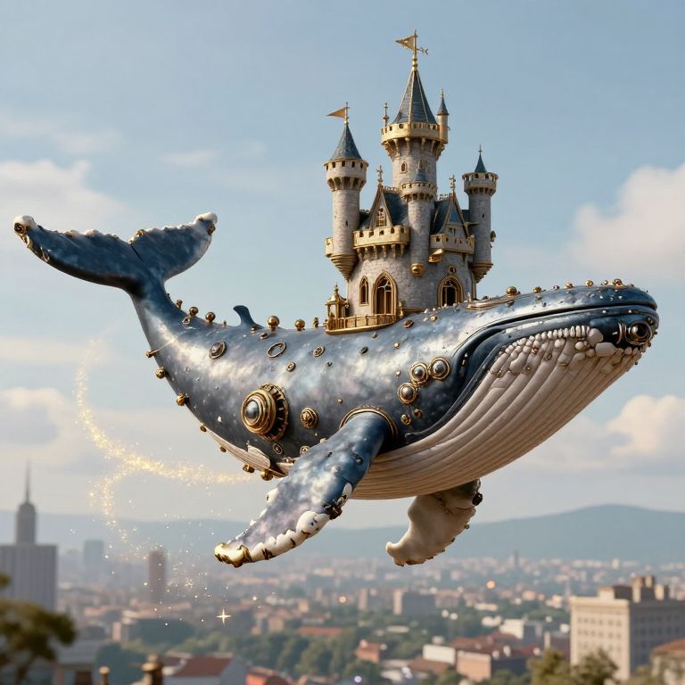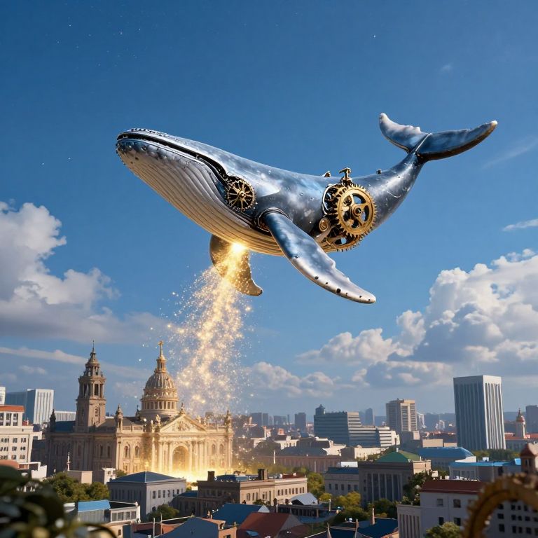 Clockwork whale soaring gracefully through the azure sky, its mechanical body spewing a radiant stream of golden stardust above a sprawling cityscape, where historic architecture and modern buildings coexist beneath a canvas of clouds and stars.