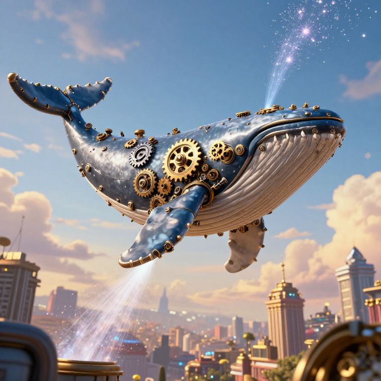 Clockwork Whale Soaring Over Cityscape