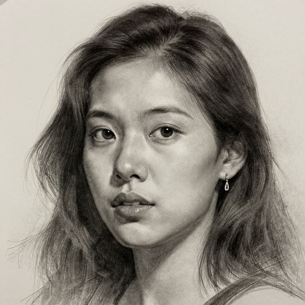 Detailed charcoal portrait captures a woman's expressive face with soft, wavy hair framing her features, accentuated by subtle shading and a delicate earring, rendered with meticulous realism against a minimalist background.