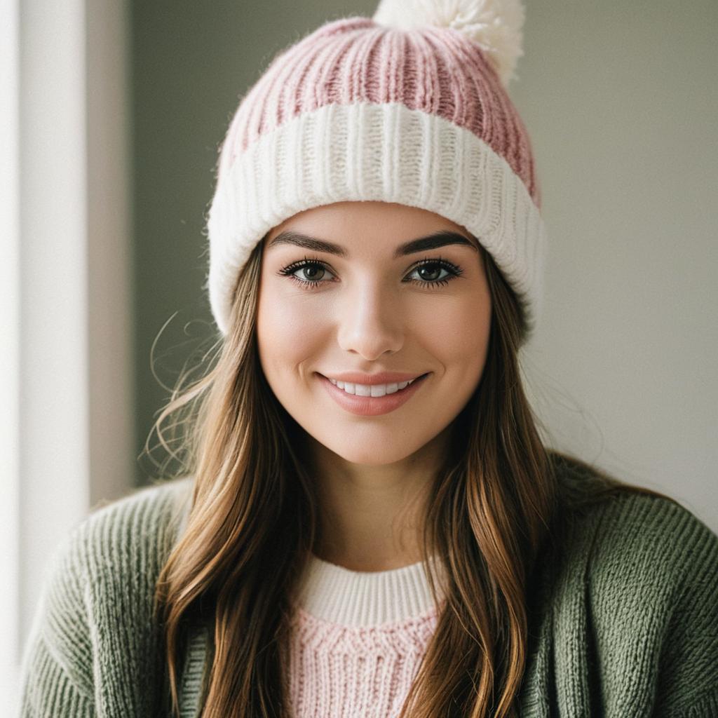 A young woman with long brown hair wearing a white knit beanie and a pink cardigan over a gray top, soft natural lighting highlighting her gentle smile and green eyes, warm tone, subtle makeup, indoors with a neutral background, realistic portrait