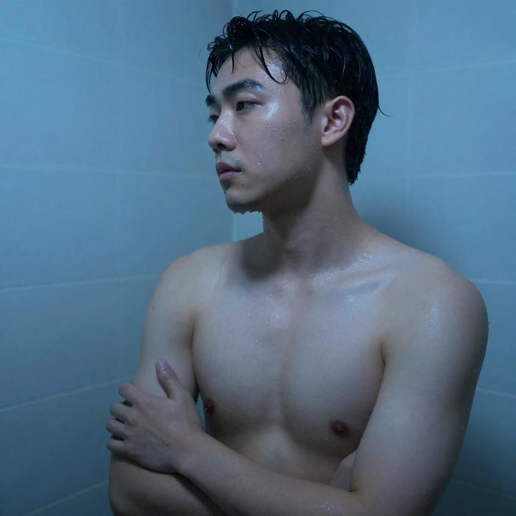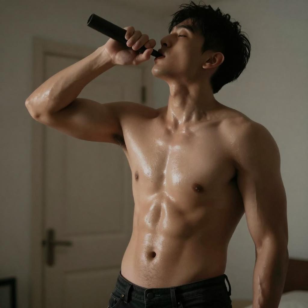 Photograph of a muscular, shirtless man with glistening, oiled skin, standing in a dimly lit room. He holds a black object to his mouth with his right hand, tilting his head back. He wears dark pants and has short, dark hair. The background is blurred, with a door and ured wall visible.