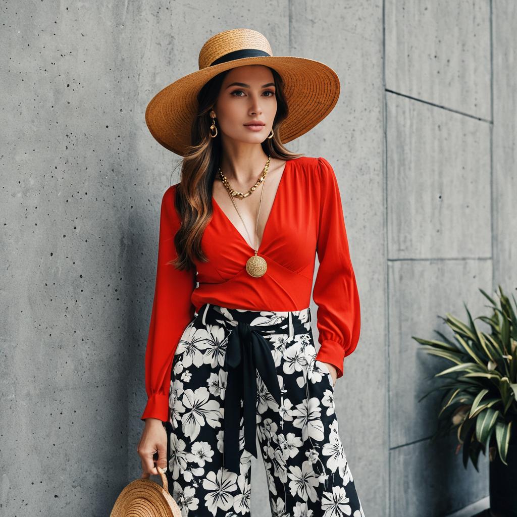 Woman, sophisticated resort, high-waisted wide-leg trousers in vibrant red, matching long-sleeve blouse with deep V-neck and tied waist, broad-brimmed straw hat with black ribbon and white floral accent, delicate gold necklace with pendant, grey concrete wall background