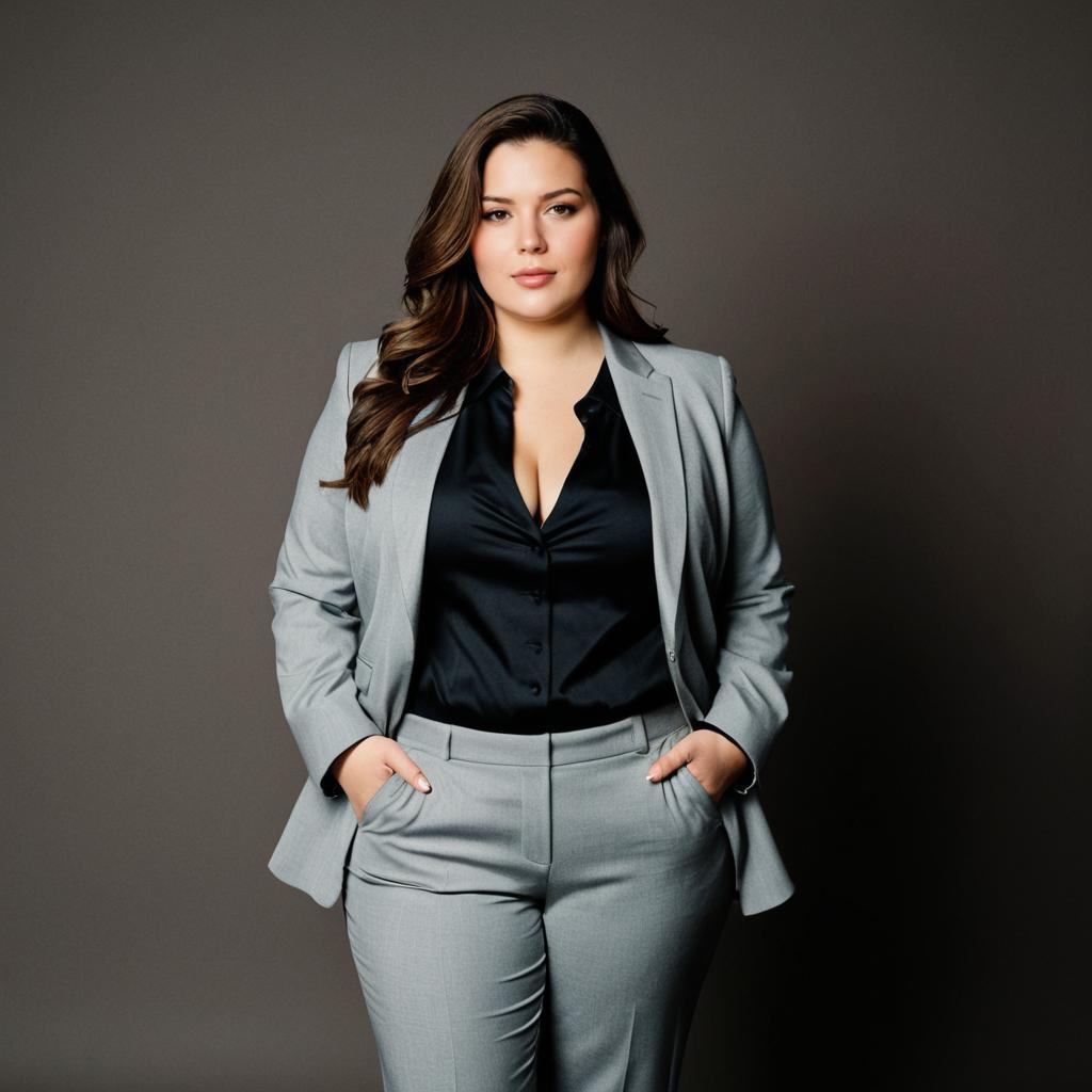 Portrait of a plus size woman with light skin and brown hair styled in a high ponytail, wearing a shiny gold blazer and matching gold pants with a black top underneath. The woman is standing against a solid gold background, looking serious and confident. Studio lighting highlights the metallic sheen of the outfit in a fashion photography style.