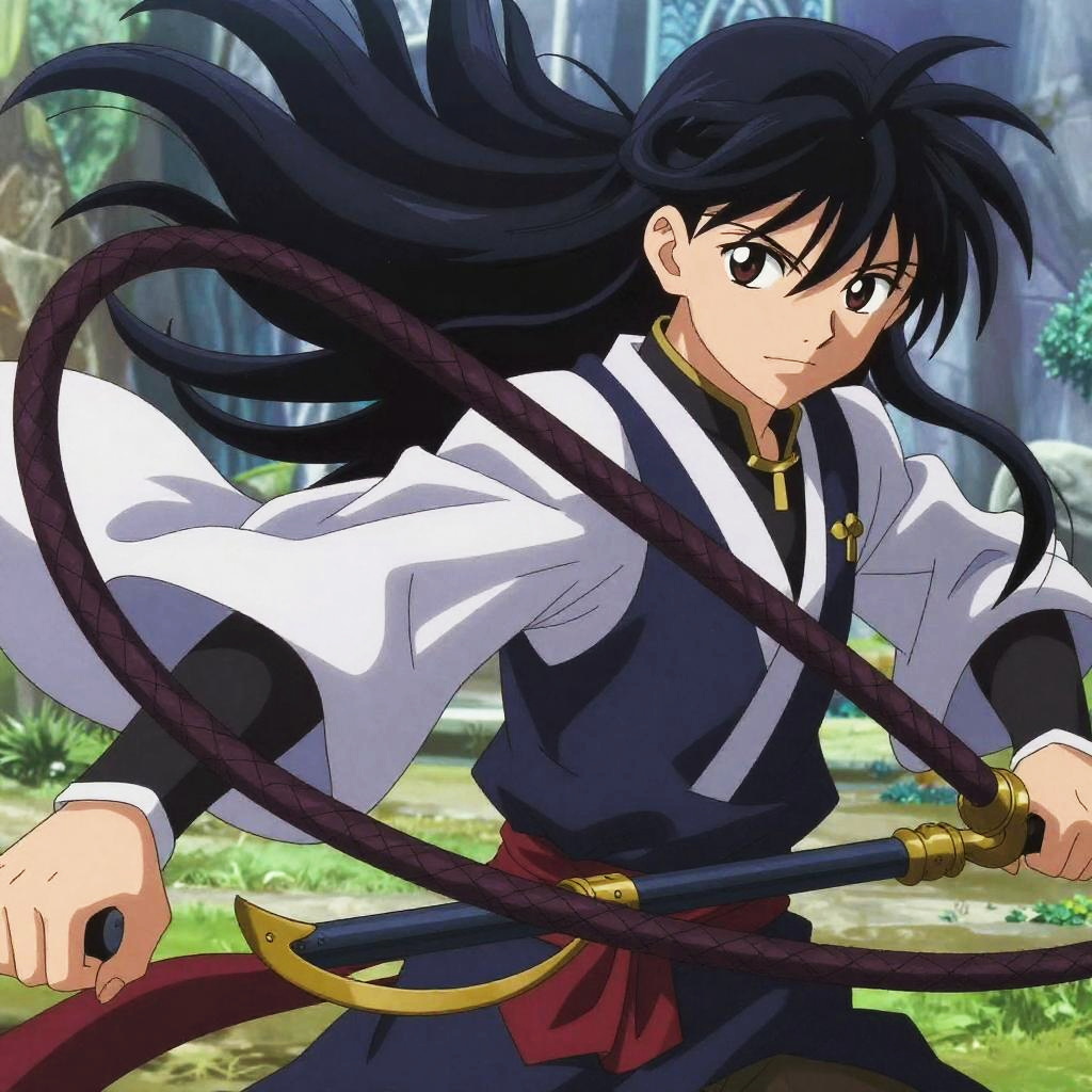 Anime face profile of a mysterious warrior with sharp angular features, intense blue eyes, dark spiky hair, wearing traditional samurai armor, stormy background, cinematic lighting, highly detailed anime illustration