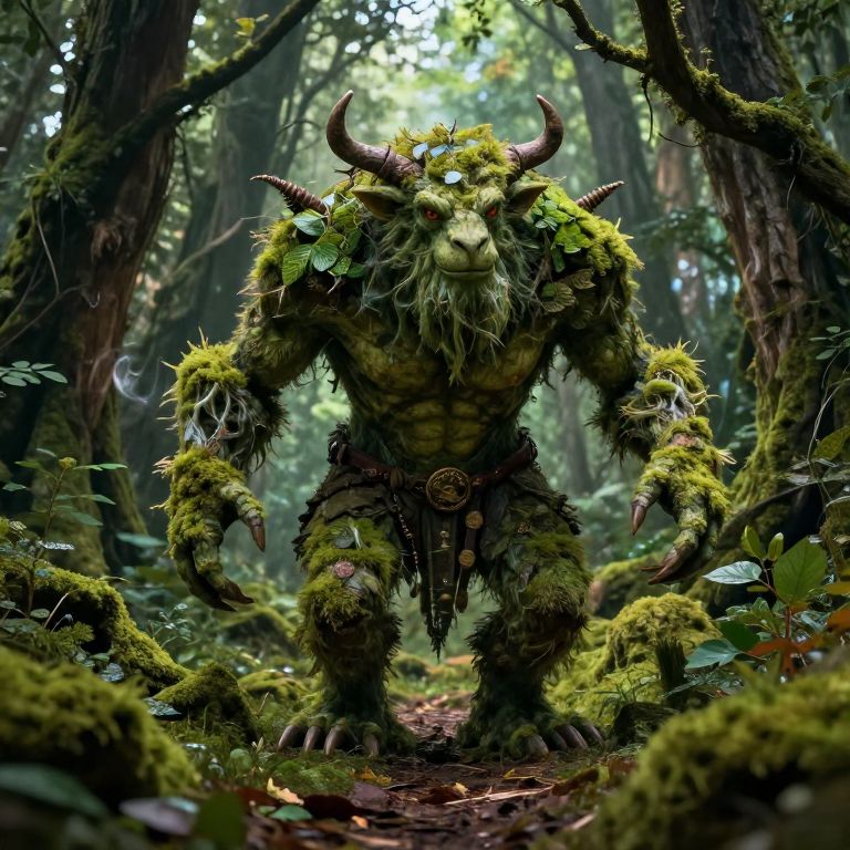 This digital artwork depicts a fearsome, muscular, anthropomorphic creature standing in a dense, forested area. The creature has green, moss-covered skin and is adorned with large, curved horns. Its face is fierce with a snarling expression, and it is surrounded by vines and leaves. It has thick, clawed arms and legs, and wears a tattered, leather-like loincloth with a circular metal ornament. The forest background is lush, with tall trees and dense foliage, illuminated by dappled sunlight. The image has a highly detailed, realistic style with vibrant colors and dramatic lighting.