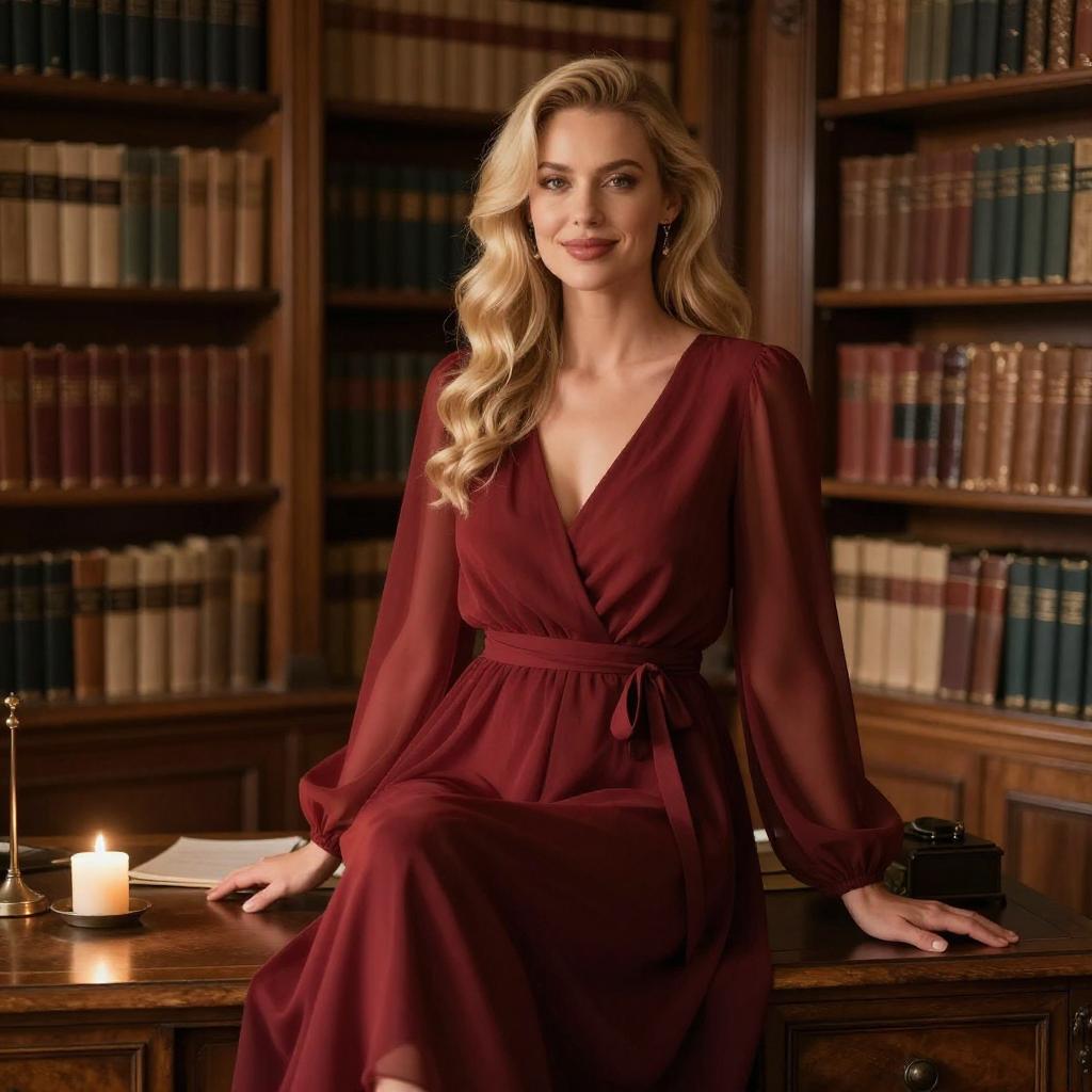Girl with long blonde hair, wearing a beige outfit with a brown belt and brown boots. She is standing in front of a brown couch with a gold frame and red curtains.