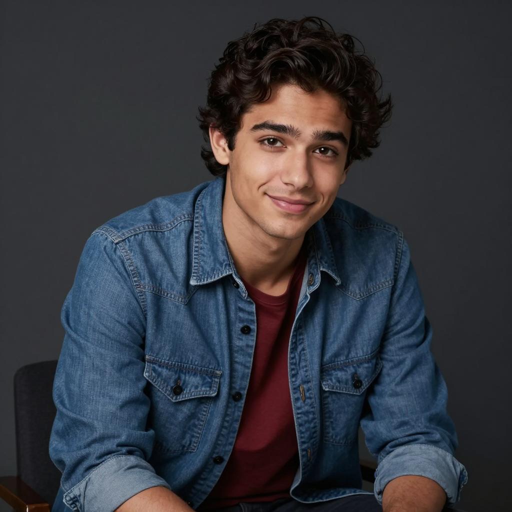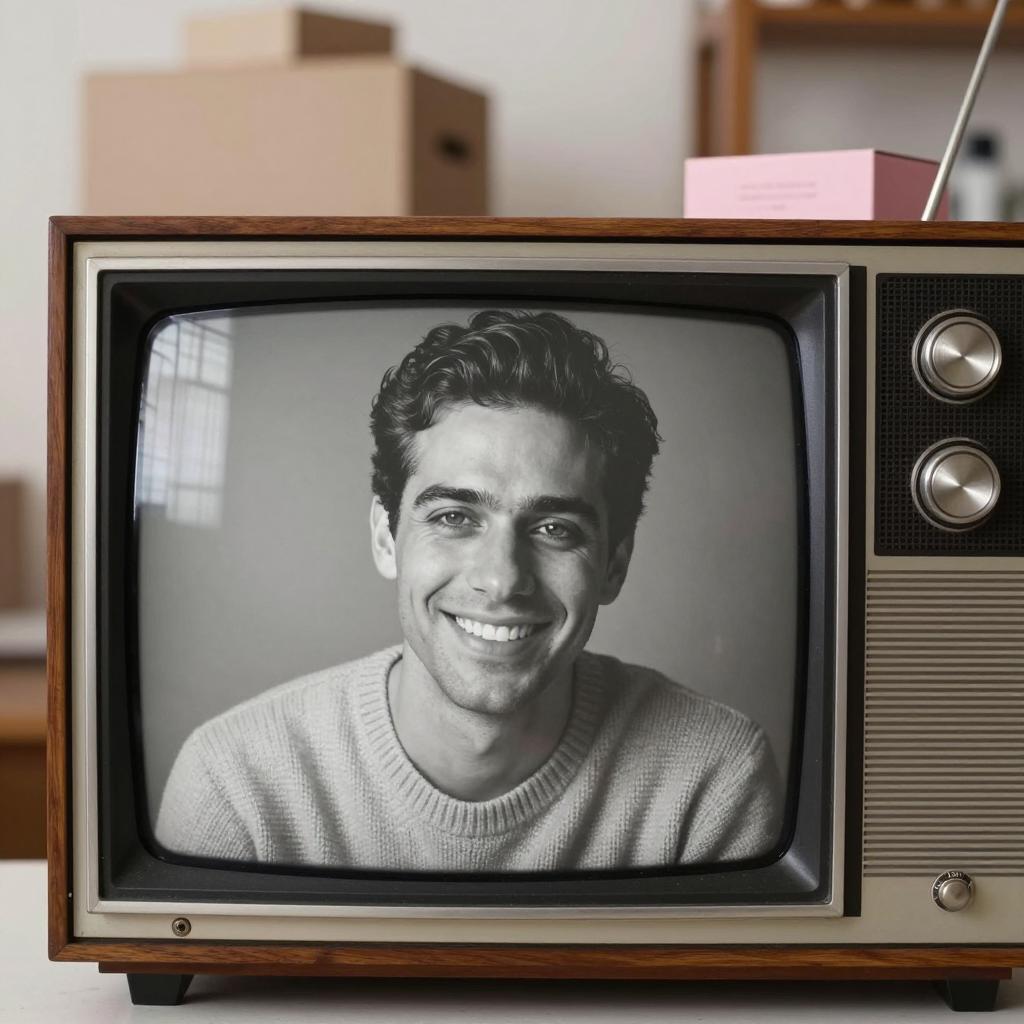 Old-style TV screen showing a black and white photo of a smiling man with short dark hair, wearing a light-colored sweater. TV has a wooden frame and a speaker on the right. Boxes and pink items on top. Background is blurred.