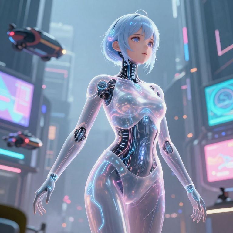 Female anime artificial intelligence concept showing a graceful android with translucent skin revealing internal circuits, ethereal light effects around her, standing amidst a futuristic city with flying vehicles and digital billboards, emphasizing advanced technology and emotion.