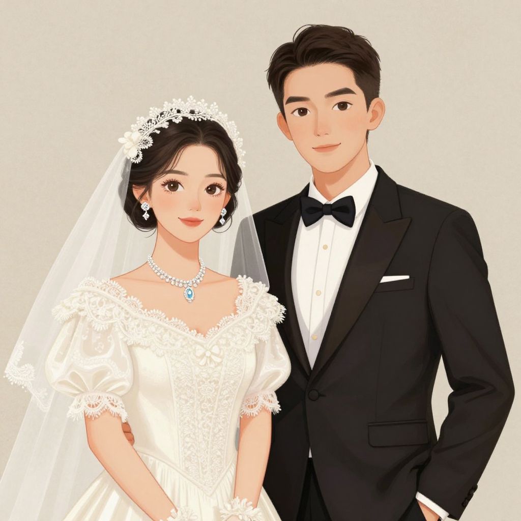 A digitally rendered illustration depicts a couple in elegant attire, with the woman adorned in a vintage-inspired bridal gown featuring lace details and a delicate veil, complemented by a sparkling necklace and earrings, while the man wears a classic black tuxedo with a bow tie, set against a soft, textured background that evokes a timeless, romantic atmosphere.
