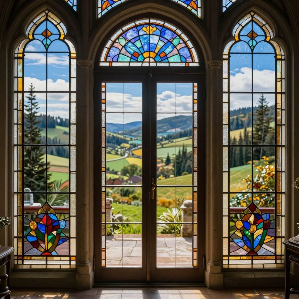 Incredibly Realistic Background, background, very realistic atmosphere, best high quality texture, hyper detailed, ultra detailed, super realistic (best high quality:1.2), 8k, HDR, ((photorealistic)), professional light, cinematic lighting, fashion photography, ambient lighting.Stained glass house, stained glass doors, fantastic landscape blur background, closeup, 8k.
