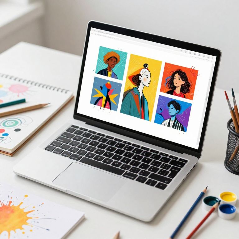 Dall·e 2 free inspired scene featuring an open laptop displaying AI-generated artworks, surrounded by creative tools like sketchpads and colorful paint splashes, bright and inviting atmosphere, digital art fusion style, high resolution