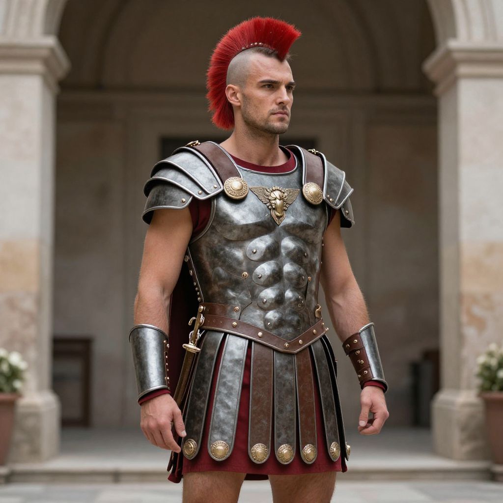 Photograph of a muscular man with a red mohawk, wearing detailed ancient Roman-style armor and skirt, standing in a stone archway.