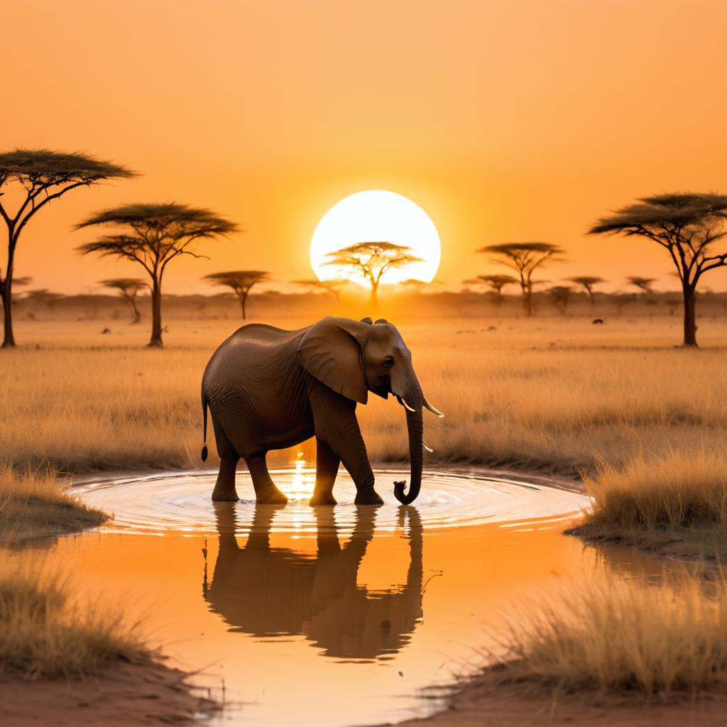 Elephant bathing in a waterhole, set in an African sunset backdrop, with soft orange and golden tones illuminating the savanna.