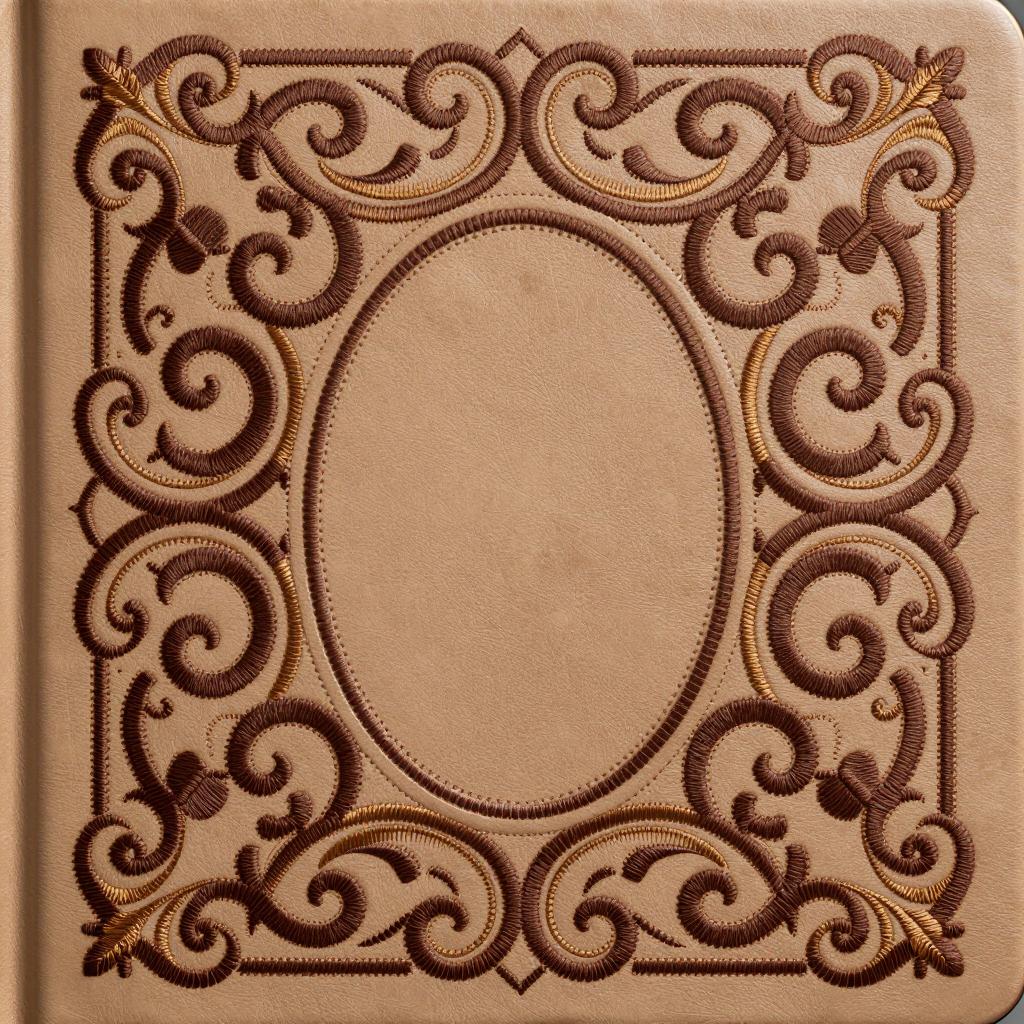 Scrollworks pattern featuring tattoo-style scrollwork with bold outlines and negative space in sepia brown scrollwork on aged paper arranged as complex frame of scrollwork leaving an oval center blank on embossed leather book cover rendered as embroidered look with thread-like texture and stitches, ultra-detailed, sharp ornamental design, high resolution, intricate decorative pattern art