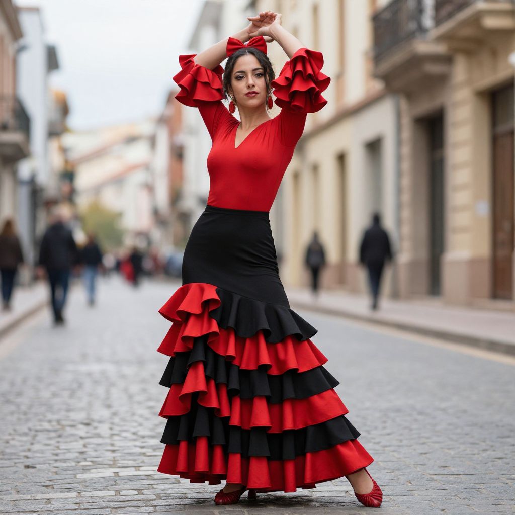Photograph of a Latina woman with dark hair in a red blouse and multi-layered black and red skirt, posing on a cobblestone street,