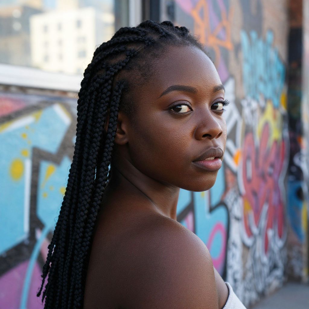 A captivating ultrarealistic portrait featuring an African American woman with intricate braids cascading down her back, captured in three-quarter view against the backdrop of vibrant urban graffiti. Her dark chocolate complexion is accentuated by soft natural light filtering through a sunlit window, highlighting her deep brown eyes that seem to hold stories within them. She wears subtle makeup and exudes confidence, hinting at an inner strength not easily missed. The setting adds texture and depth, drawing the viewer into her world of vibrant colors yet maintaining privacy in an urban environment.