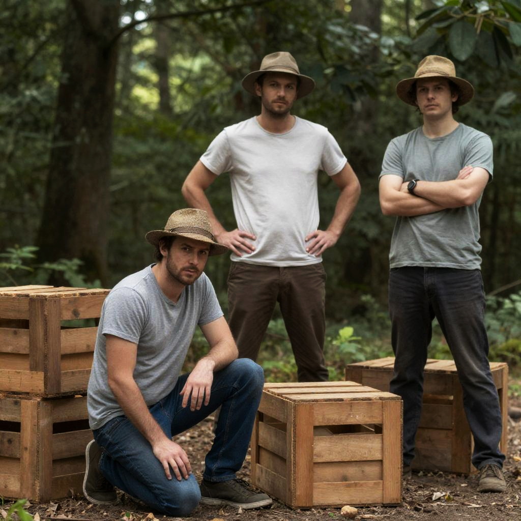 Black-and-white photograph of three men in a cave. Left man in dark leather coat, hat, holding cup, right man in light shirt, pants, squatting, middle man reclining, light shirt, dark pants. Dogs and mugs around them. Rocky cave background. Intense expressions.