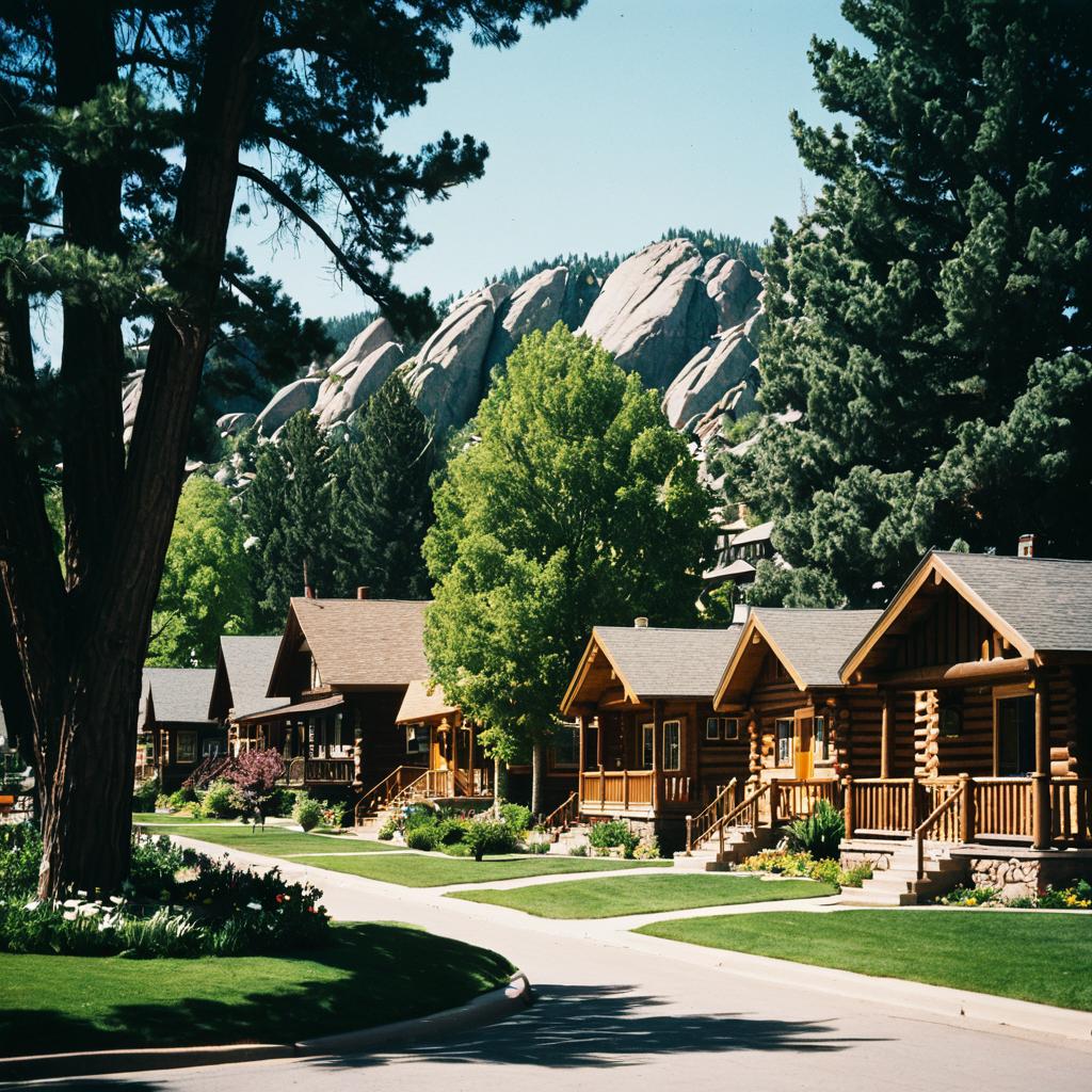 Irony Create an image that captures the essence of a picturesque Boulder neighborhood, featuring a variety of inviting log cabins, tree-lined streets, and well-maintained gardens. The image should evoke a sense of warmth, community, and the appeal of living in a vibrant, friendly environment.