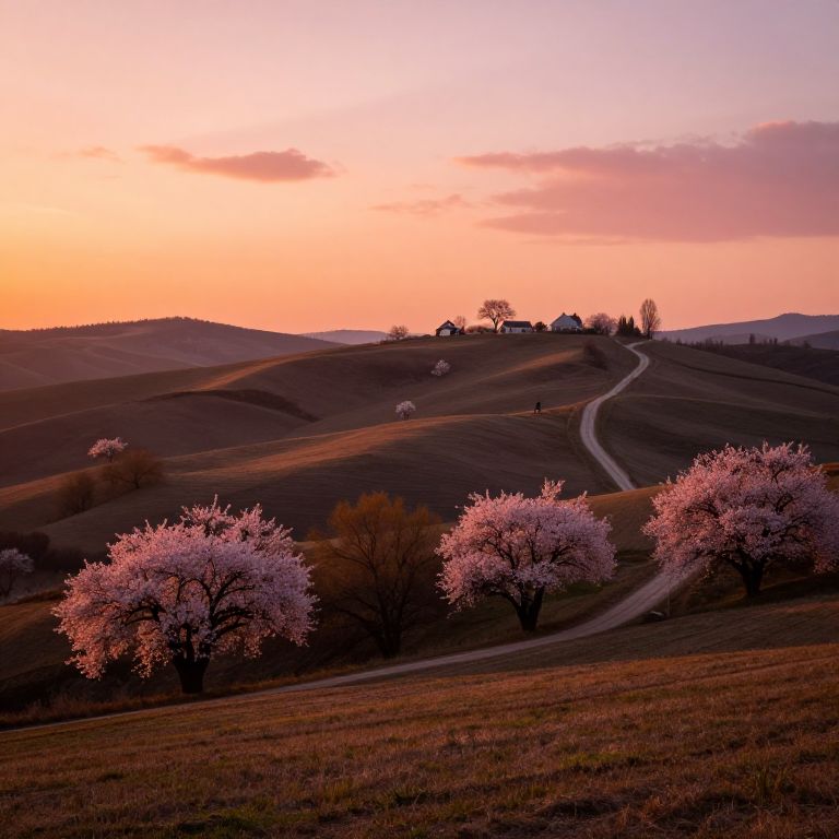 Petang landscape with rolling hills bathed in orange-pink twilight, blossoming flowers catching last rays, a winding path leading to a distant farmhouse, sky painted with soft clouds, inviting a sense of calm and reflection.