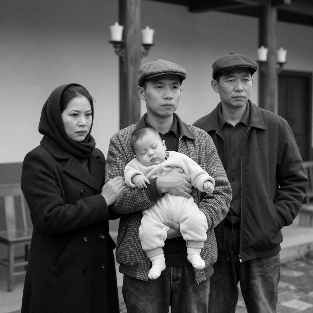 Black-and-white photograph of two men standing outside a wooden building. The man on the left, with short hair and a vest over a shirt, raises both arms with fingers pointing upwards, shouting. The man on the right, with short hair and a button-up shirt, looks ahead with a neutral expression. The building has a window and a door in the background.