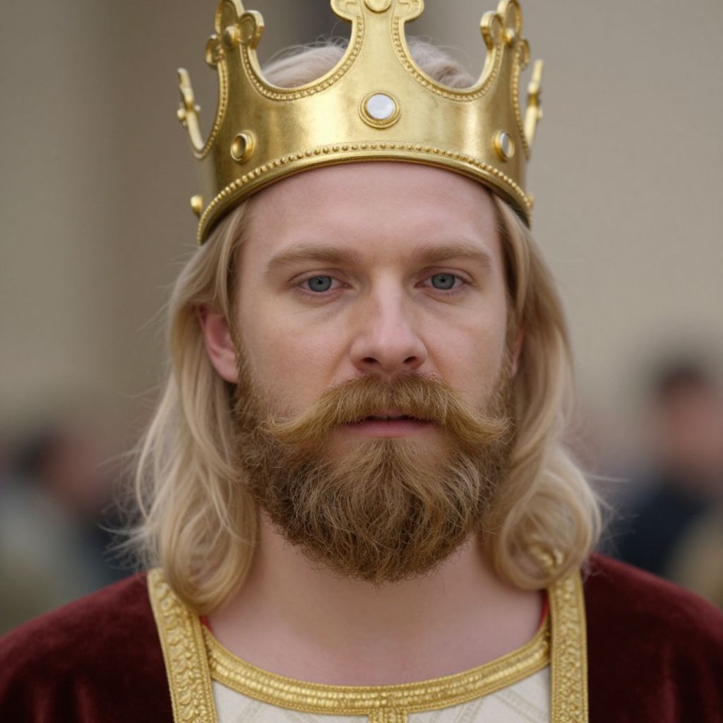 Photograph of a fair-skinned man with long blonde hair, blue eyes, and a full beard, wearing a golden crown and maroon robe.