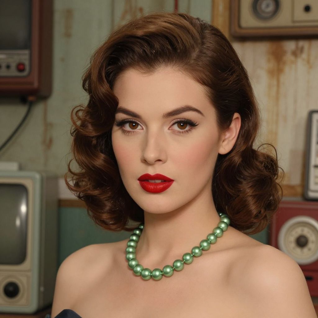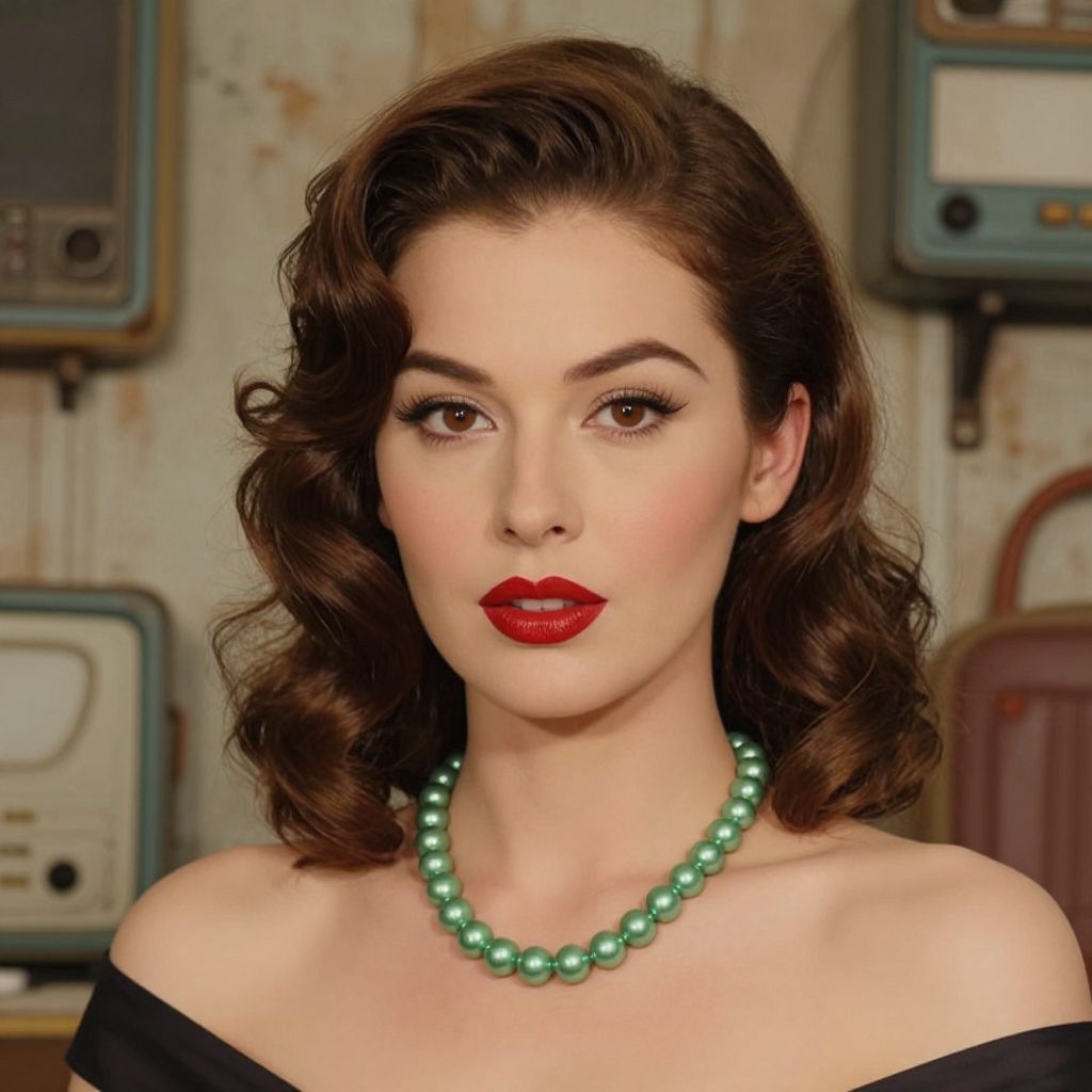 A digitally rendered portrait featuring a woman with vintage-inspired styling, characterized by her wavy brown hair, bold red lipstick, and elegant green pearl necklace, set against a rustic, weathered background reminiscent of plastic classics and found objects, evoking a retro aesthetic akin to famous portraits by Jane Perkins.