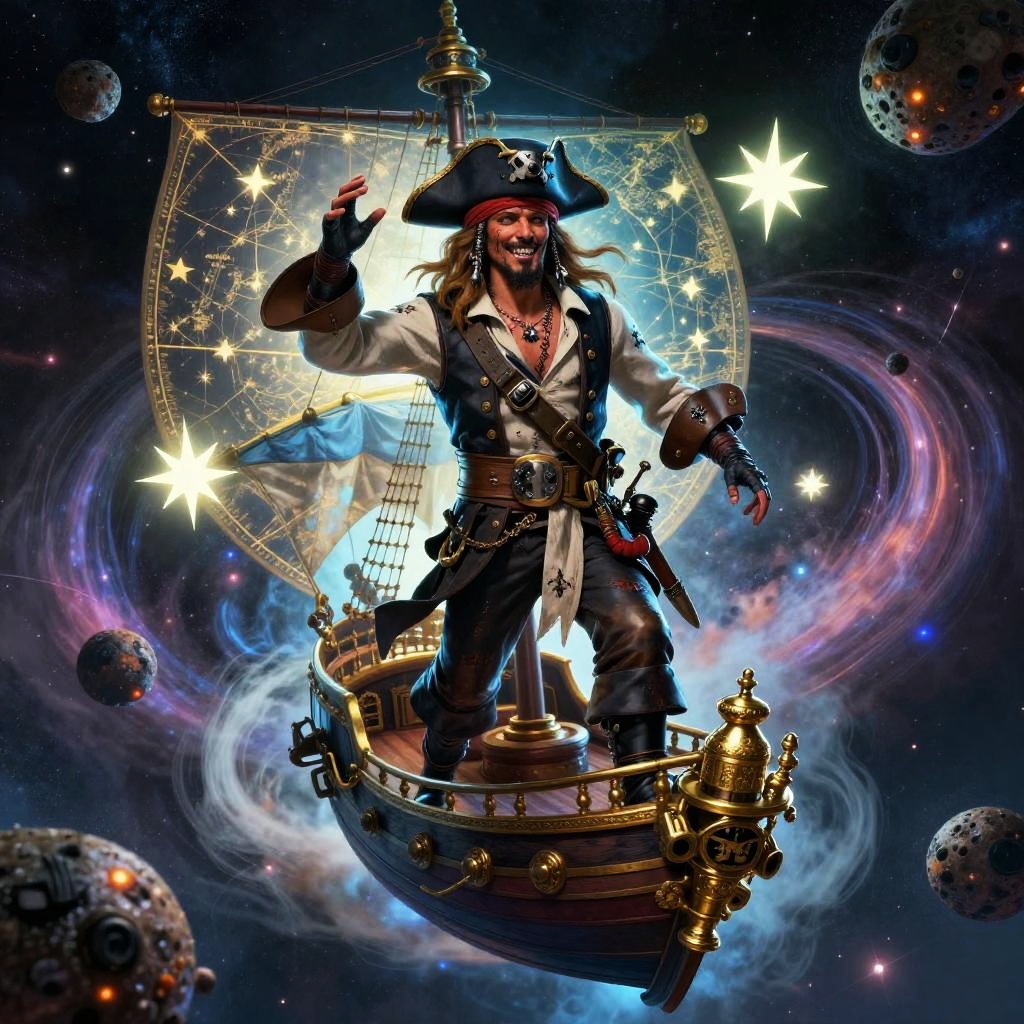 A cosmic pirate captain, with scars and a rogue's grin, surrounded by glowing star maps and swirling cosmic dust, in a pirate ship drifting through an asteroid belt, depicted in the genre-blending and ethereal style of Yoko Kanno.