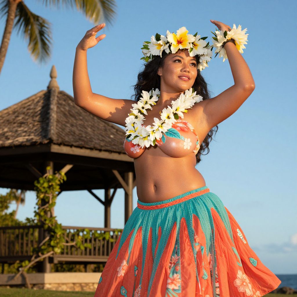 A realistic beachside scene of a beautiful woman in a traditional Hawaiian hula costume, with smooth, sun-kissed skin and deep brown eyes, wearing a turquoise and coral hula skirt and a floral top, dancing under a clear blue sky with golden hour lighting, holding a large lei made of white and yellow hibiscus flowers, standing in front of a traditional Hawaiian pavilion with tropical vines and palm fronds, capturing the cultural celebration of hula and nature.. The woman has big tits and cute face