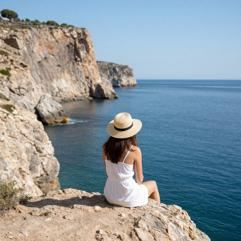 Woman sitting on rock by sea. view, cliff, summer, vacation, travel.