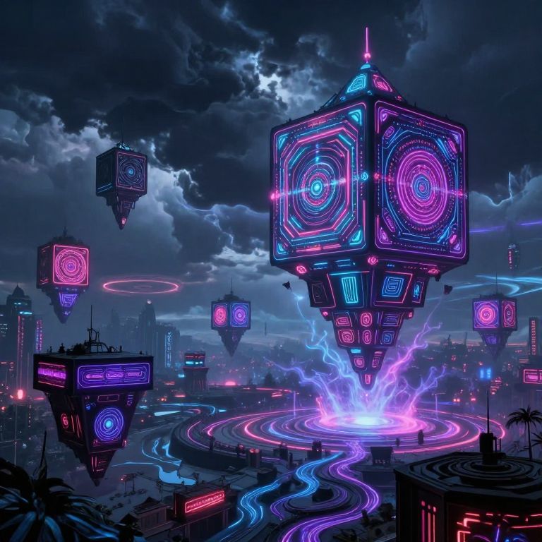 A vibrant digital artwork depicts a futuristic cityscape under a stormy night sky. Neon-lit floating cubes with glowing circular patterns hover above winding, neon-blue roads. Central cube emits a bright purple light, surrounded by electric sparks. Background features dark, cloudy sky with a visible star. Cityscape includes silhouetted skyscrapers and palm trees, adding depth. Colors are predominantly blue, purple, and pink, creating a cyberpunk aesthetic. The scene is dynamic and futuristic, with a focus on glowing technology and electric energy.