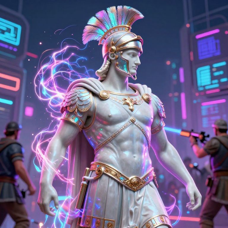 Futuristic AI art representation of Alexander the Great, combining classical heroic postures with advanced robotic enhancements, artistic mix of marble textures and glowing circuit patterns, background of a digitized conquered world map, intense gaze and commanding aura with a surreal sci-fi vibe.