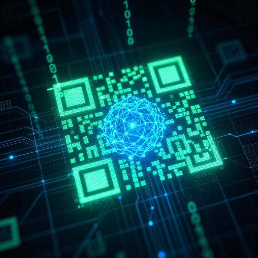 An imaginative AI QR code generator embedded in a digital matrix, with luminescent green and blue QR codes emerging from a neural network core, surrounded by floating binary data and transparent circuit grids, in a dark, high-tech sci-fi setting.