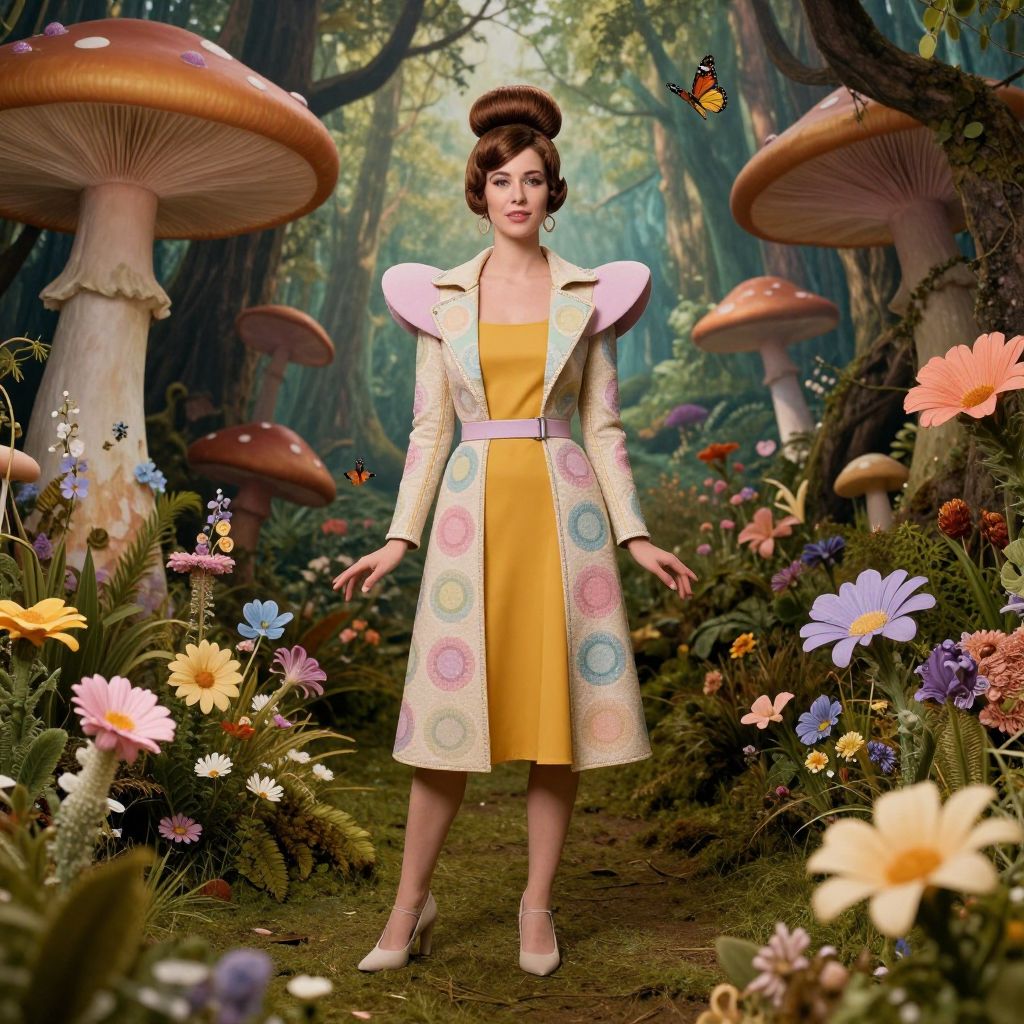 In this vibrant and surreal scene, a woman stands as the central figure, her mod, art nouveau beehive hairstyle and retrofuturistic clothing evoking a 1970s aesthetic. The pastel colors of her outfit, featuring circular patterns and a mustard yellow dress, contrast beautifully with the lush, fantastical forest surrounding her. The forest is teeming with whimsical elements: large, mushroom-like structures, blooming flowers in soft hues, and fluttering butterflies. The spatial relationships are dynamic, with the woman positioned centrally, the mushrooms and flowers framing her from all sides, and the butterflies adding a sense of movement. The overall composition is balanced, with the woman's attire and the forest's elements interplaying to create a harmonious yet otherworldly scene, reminiscent of Alice in Wonderland.