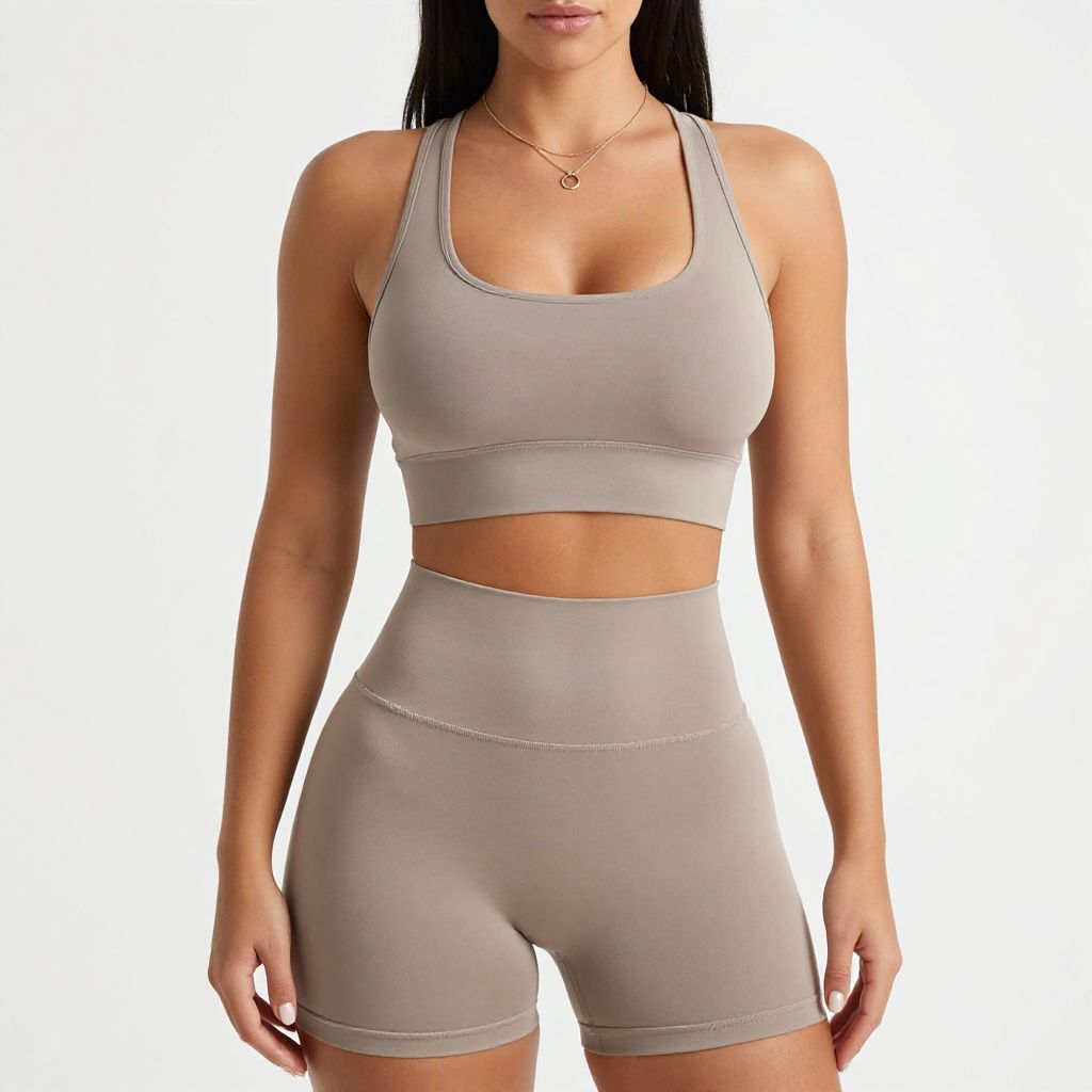 "Woman, athleisure, scoop neck crop top in neutral taupe, sleeveless, racerback design, paired with matching high-waisted bike shorts, seamless fabric, body-hugging fit, minimalist pendant necklace, plain white background. Sexy. Pretty face and beаutiful eyes. Big breasts."
