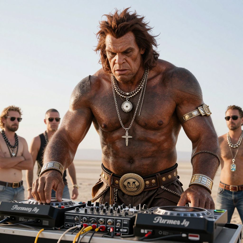 Leathery Andre the Giant and his entourage as a house DJ at Burning Man, intricate detail, octane render, 8k,