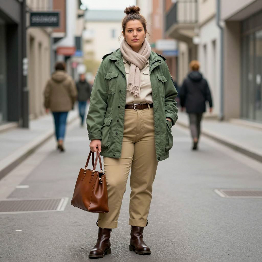Hela costume plus size, photorealistic street fashion model, standing confidently, urban alleyway background, daytime, woman with fair skin, brown hair in bun, green military-style jacket, beige shirt, khaki pants with brown belt, brown leather boots, beige scarf, brown handbag, blurred pedestrians and buildings, soft sunlight, casual yet stylish, realistic ures, realistic shadows and lighting, balanced composition, modern urban style