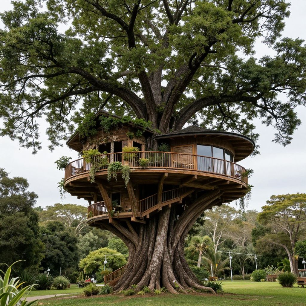 Photograph of a large, wooden treehouse built high in the branches of a massive, ancient tree with a thick, sprawling trunk and dense, green foliage. The treehouse has a circular design with multiple levels, featuring wooden railings, large windows, and a small balcony with potted plants. The background shows a lush garden with various trees and shrubs, under a bright, cloudy sky. The treehouse blends seamlessly with the natural surroundings, and its rustic wooden texture contrasts with the tree's rough, dark bark. The scene evokes a sense of whimsy and tranquility.