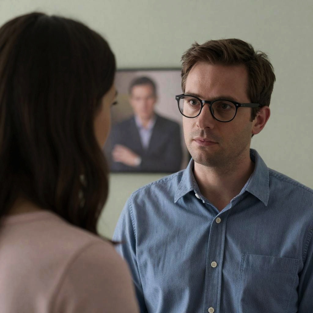 Photograph of a man with brown hair, glasses, and a blue striped shirt looking intently at a woman with long brown hair and a pink shirt. The woman's face is partially shadowed. Background shows a blurred photo on a light green wall. The man's expression is serious, the woman's expression is neutral.