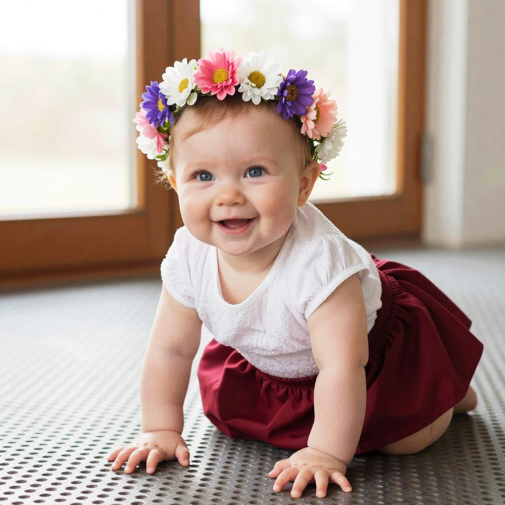A cute, smiling baby girl with fair skin and light blonde hair is crawling on a perforated metal surface. She's wearing a white, short-sleeved, textured top and a deep red skirt. Her head is adorned with a colorful flower crown featuring pink, purple, and white flowers. The background shows a bright window with wooden frames. The image is bright and cheerful.
