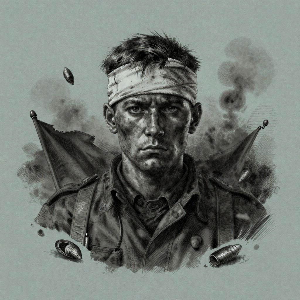 Black and white digital drawing of a serious, battered soldier with a bandaged head, military jacket, and falling bullets in the background.