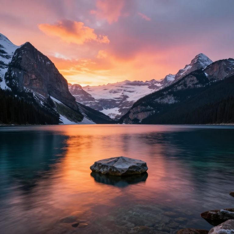 Photograph of a serene mountain lake at sunset, with a large rock in the foreground, reflecting vibrant orange and pink sky, surrounded by snow-capped