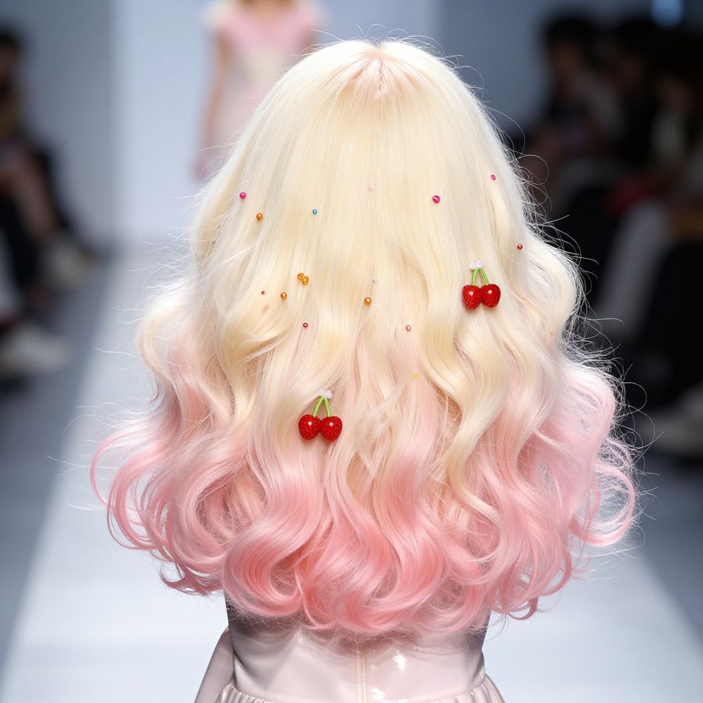 Photograph of a model's back with platinum blonde hair with pink tips, adorned with small red cherry hairpins, walking on a bright runway.