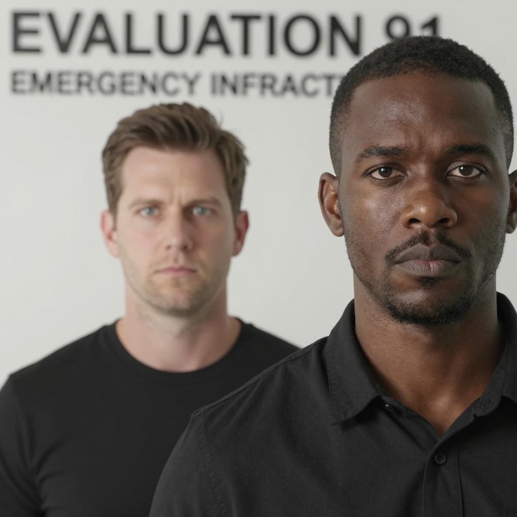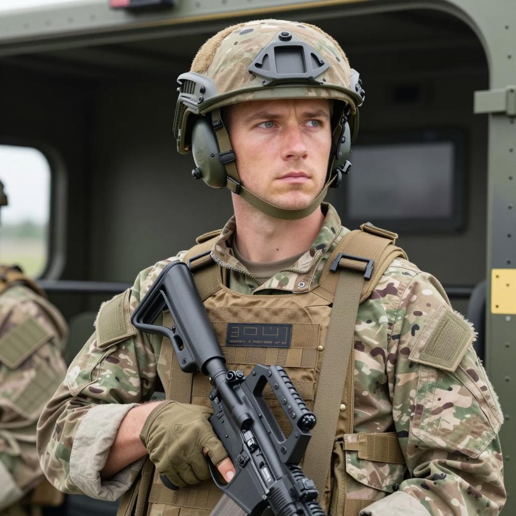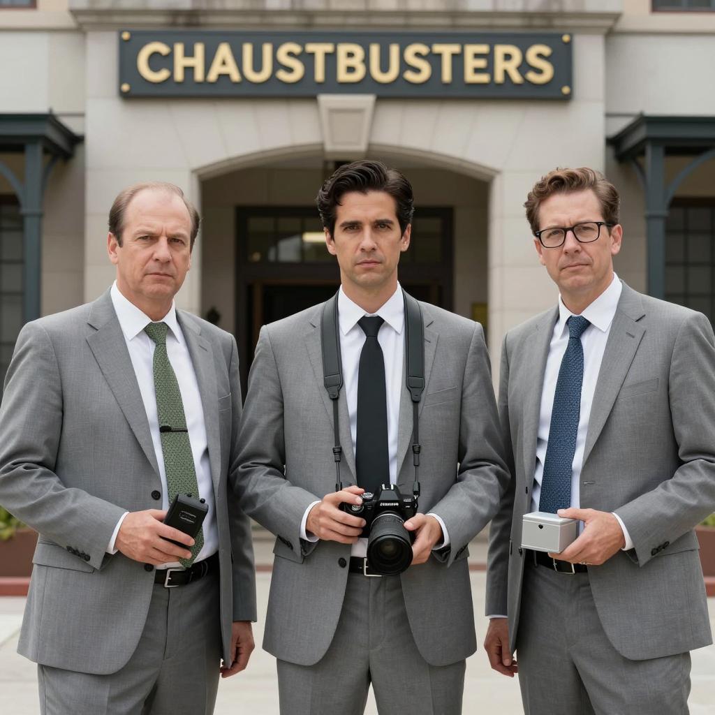 Photograph of three men in military-style clothing with green vests and "TECH" patches. The man on the left has a camera on his head, the center man has curly brown hair and glasses, the right man has short, light brown hair. "No Smoking" sign in background. All men have neutral expressions. Equipment and backpacks behind them.