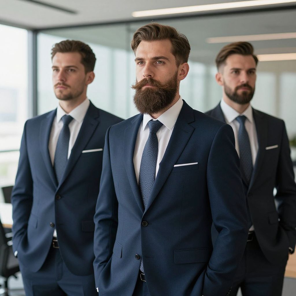 Photograph of three Caucasian men with dark hair and beards, standing in a modern office with large windows. All wear dark blue, tailored suits with white shirts and navy ties, and have white pocket squares. The central man, with a full beard, stands slightly forward, gazing directly at the camera. The other two men, both with short beards, stand to his left and right, looking towards the camera. The office background is bright with natural light filtering through the windows. The men's expressions are serious and confident.