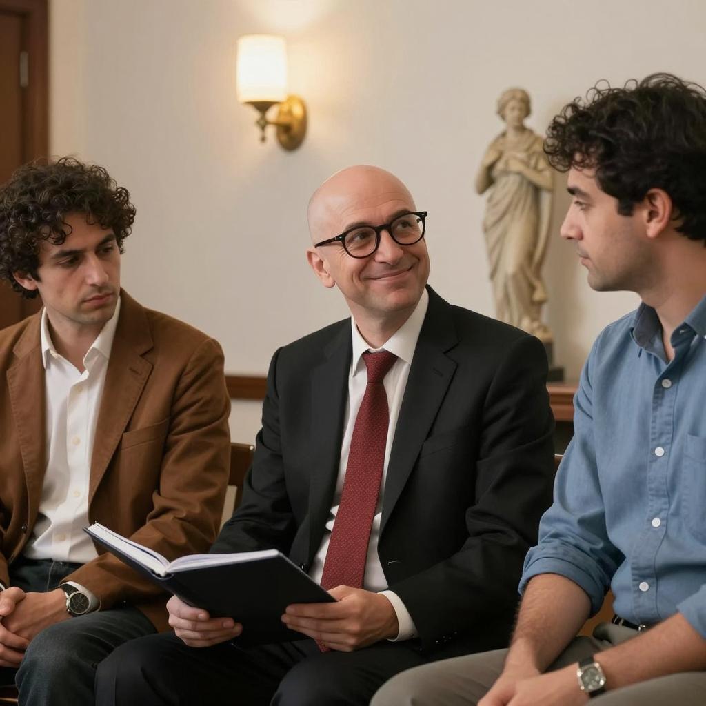 A bald middle-aged man dressed in a dark suit, white shirt, and patterned tie sits on beige stairs. He is positioned next to an ornate dark wooden railing with intricate circular patterns. The warm, dim lighting casts a contemplative mood as the man looks downward, hands clasped, wearing black dress shoes and a wristwatch.