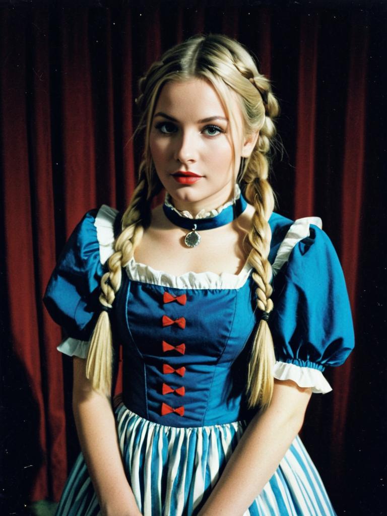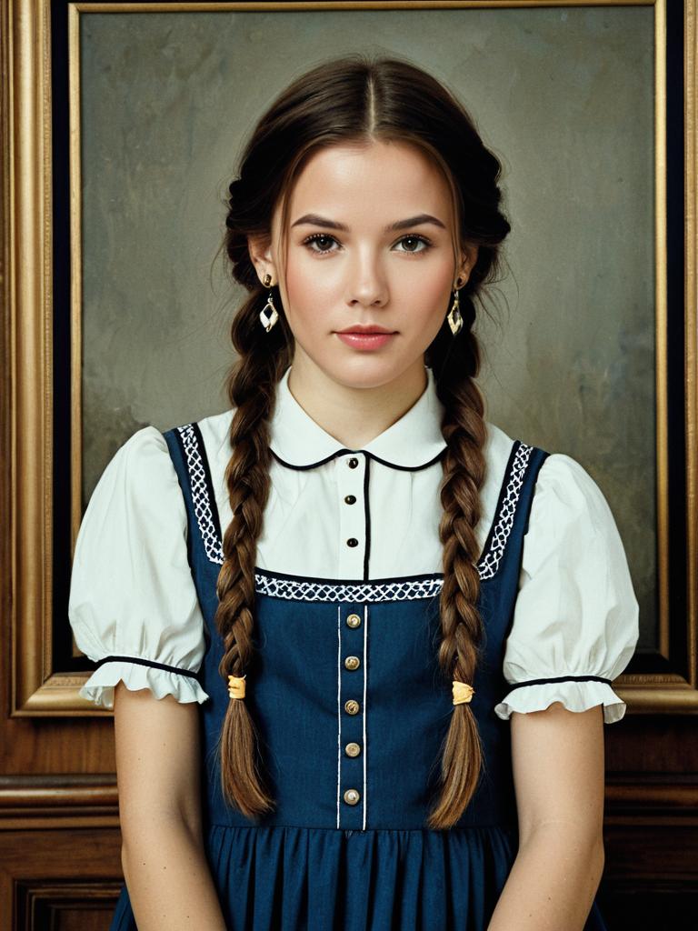 Portrait of a young woman wearing a traditional Bavarian beer wench costume featuring a black and brown dress with white ruffles and puffy short sleeves. She has brown hair styled in twin braids adorned with orange flowers, and she wears floral earrings and a simple necklace. The background is plain, emphasizing her attire and hairstyle.