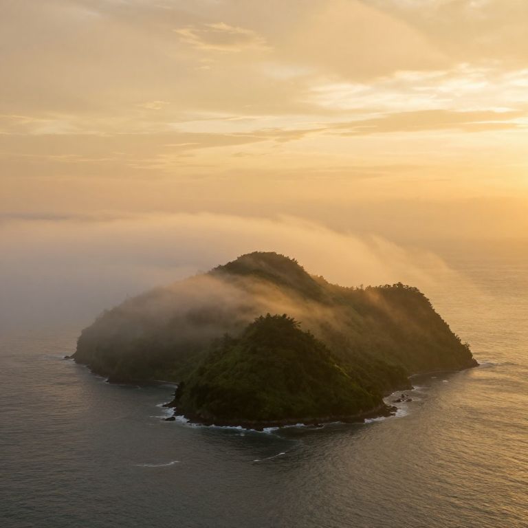 A mystical isle cloaked in ethereal mist rises dramatically from the sea, its verdant slopes bathed in the golden glow of a setting sun, defying the ordinary with its serene yet otherworldly presence.