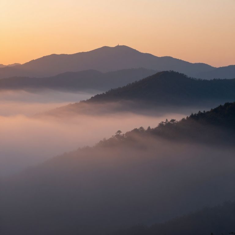 Serenity washes over the soul as mountains dissolve into a sea of mist, their silhouettes bathed in hues of twilight that whisper of infinite possibility and the quiet embrace of the unknown.